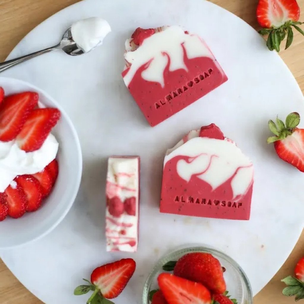 Dopřejte si sladký dotek léta s ručně vyráběným přírodním mýdlem Strawberry & Cream, které voní jako čerstvé jahody s cukrem a nadýchanou šlehačkou. Každé mytí se promění v gurmánský zážitek pro smysly.