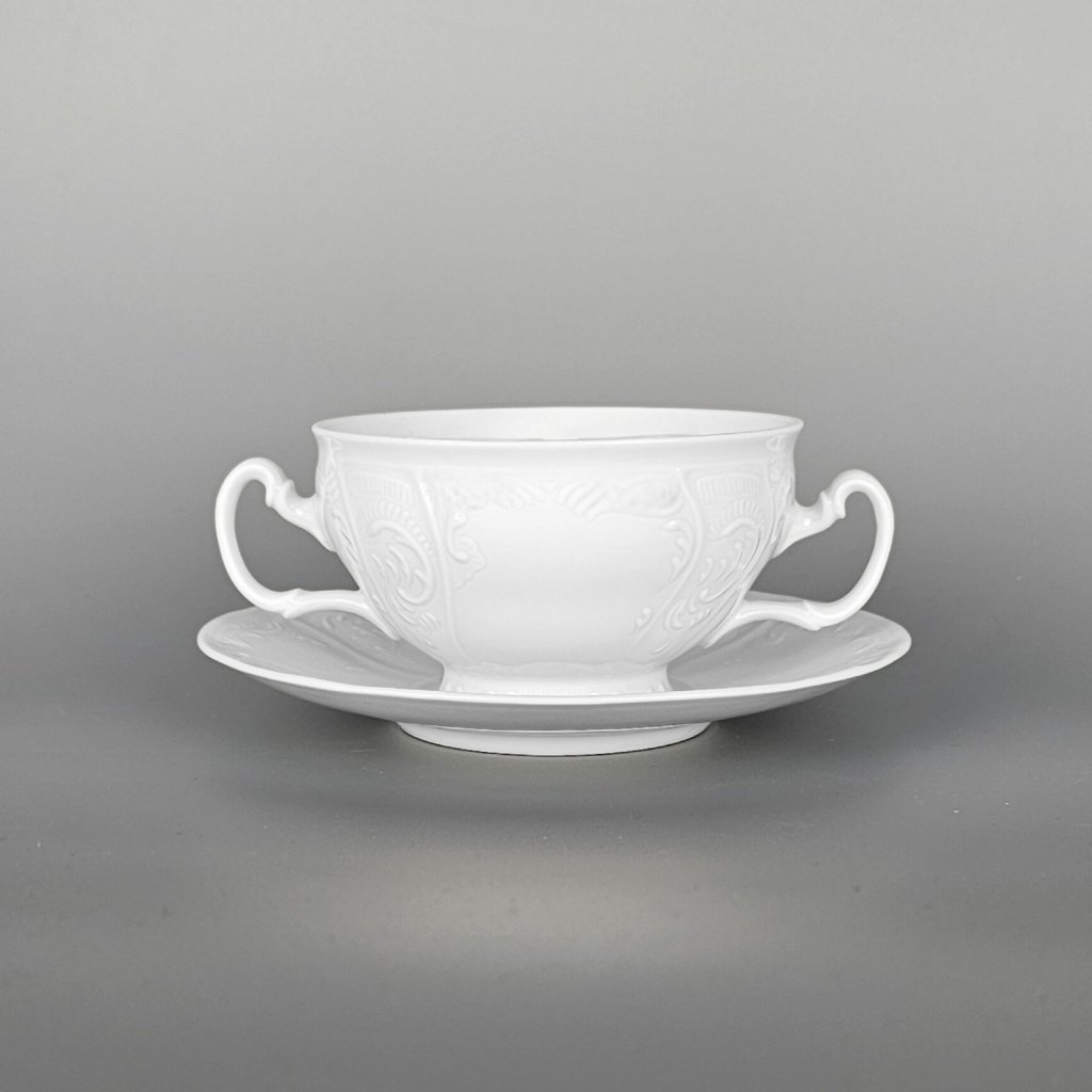 Porcelánová šálka na polievku s uškami a podšálkou biela BERNADOTTE.
