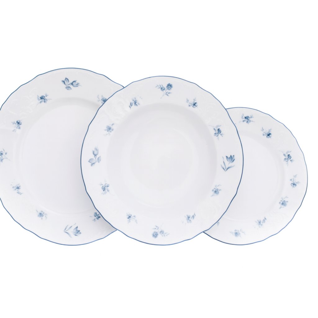 Thun 1794 BERNADOTTE tanierová súprava biela modré rúžičky 18 dielna