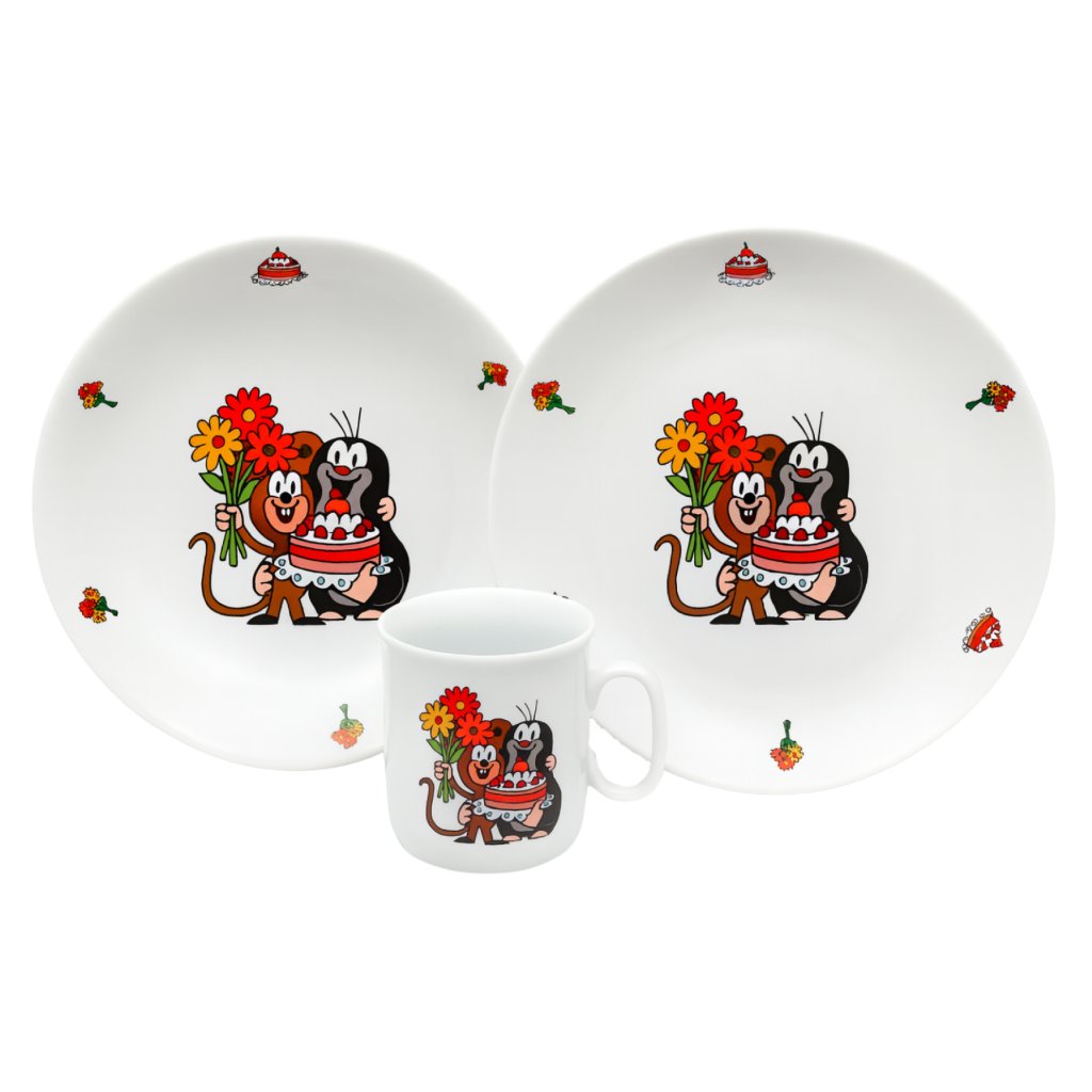 Porcelánová tanierová súprava biela ANGELIKA s motívom krtko a torta.