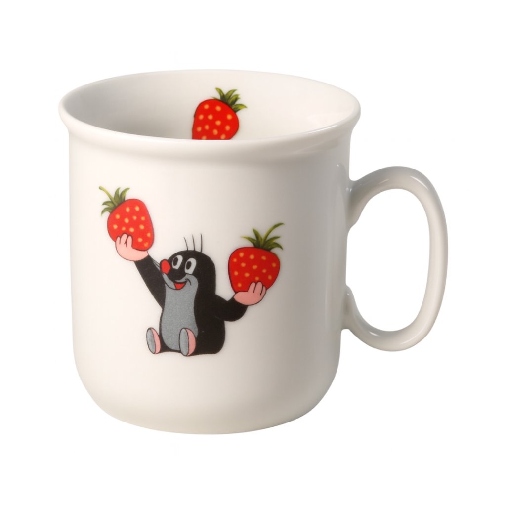 Porcelánový hrnček detský biely KRTKO s jahôdkami.