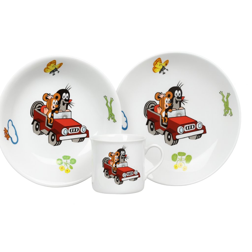 Porcelánová tanierová súprava biela ANGELIKA s motívom krtkov v aute.